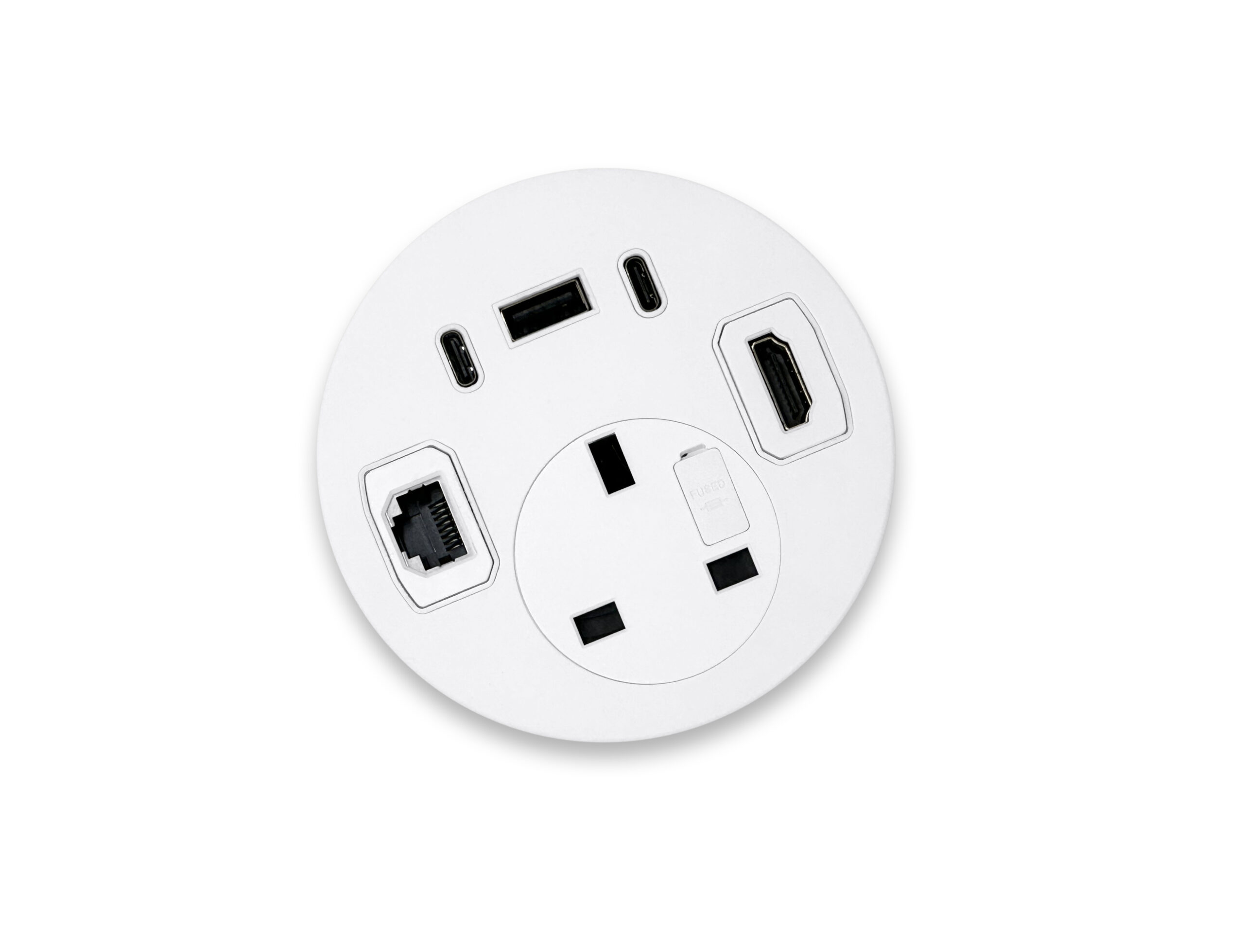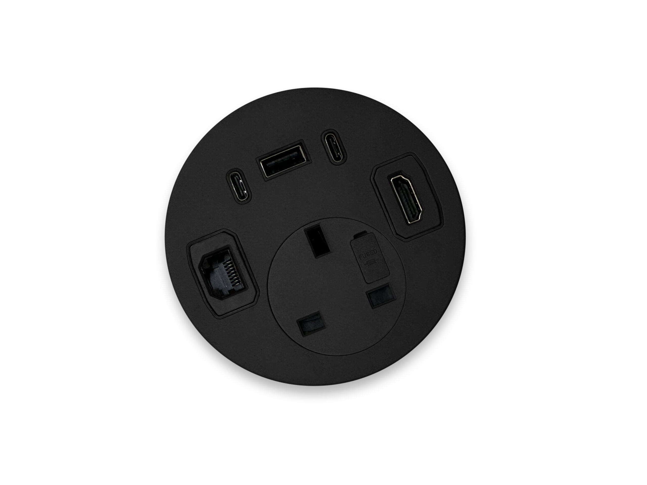 In-Desk Power Modules – Elio 80 Series 2 with 1 power, triple USB, 1 HDMI and 1 Cat6 UTP data.
